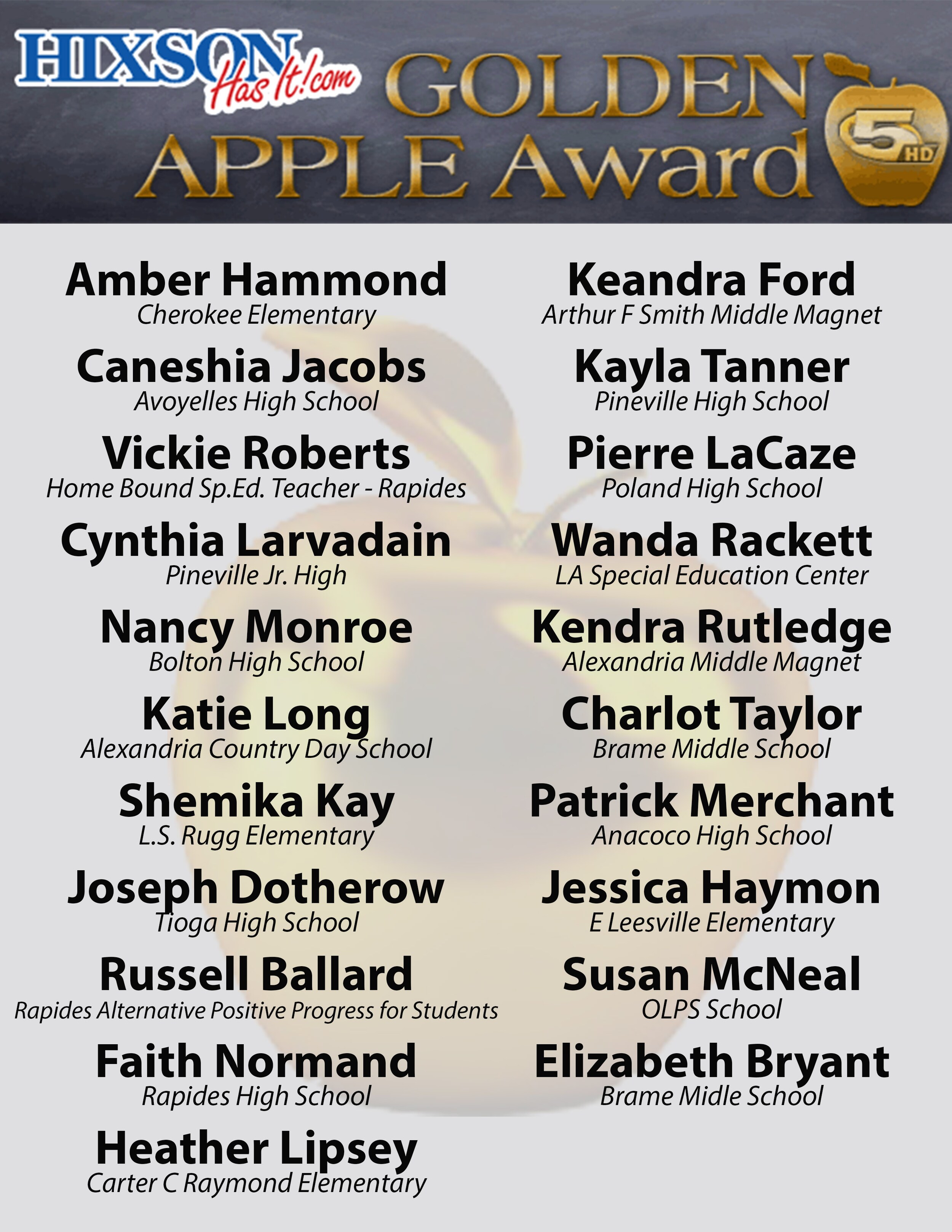 The Golden Apple Award honors those who believe in the true spirit of teaching by making classrooms a fun and safe place of learning. News Channel 5 and Hixson Autoplex are recognizing outstanding teachers - the everyday heroes who make the crucial difference in our children's lives.