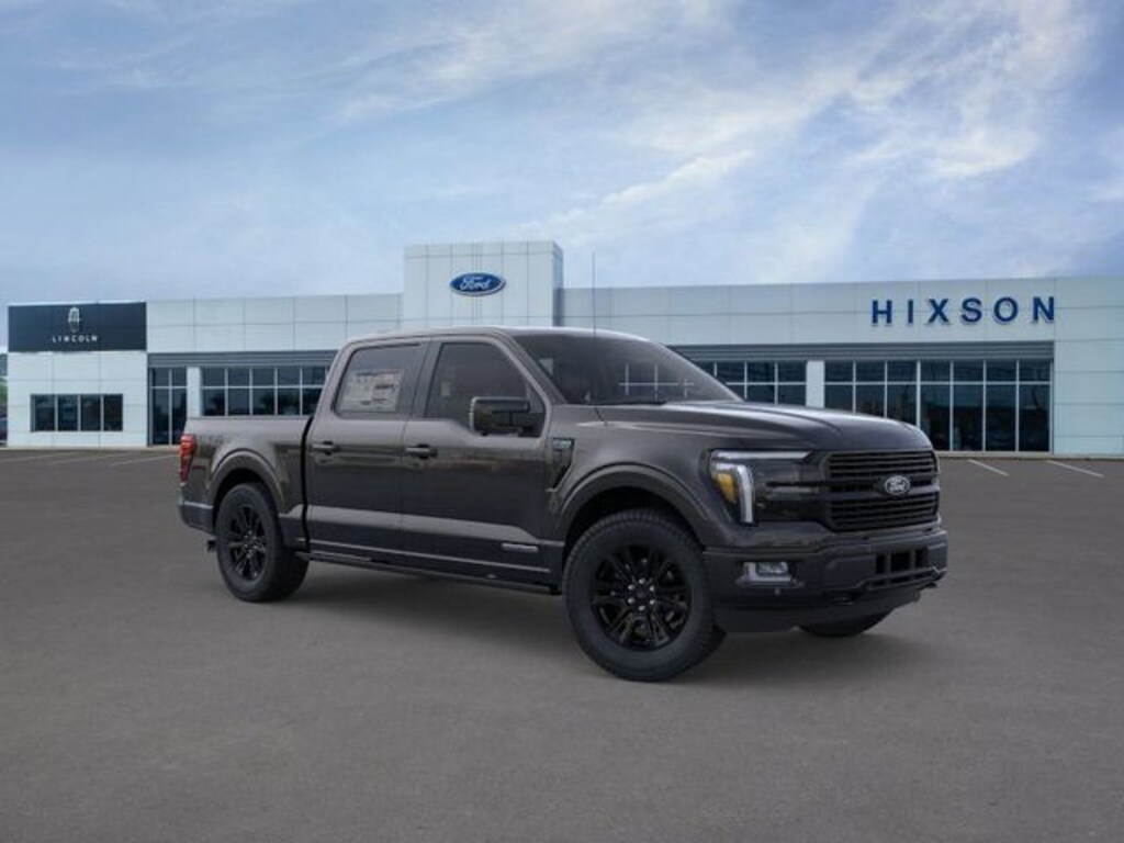 Agate Black Metallic 2025 Ford F-150 Platinum 4WD 10-Speed Automatic 3.5L PowerBoost Full-Hybrid V6 DEALER INSPECTED, 3.5L PowerBoost Full-Hybrid V6, 4WD, 4-Wheel Disc Brakes, 4x4 FX4 Off-Road Bodyside Decal, 8 Speakers, ABS brakes, Adjustable pedals, Air Conditioning, Alloy wheels, AM/FM radio: SiriusXM with 360L, Auto High-beam Headlights, Auto tilt-away steering wheel, Auto-dimming door mirrors, Auto-dimming Rear-View mirror, Automatic temperature control, Brake assist, Bumpers: body-color, Compass, Delay-off headlights, Driver door bin, Driver vanity mirror, Dual front impact airbags, Dual front side impact airbags, Electronic Stability Control, Emergency communication system: SYNC 4 911 Assist, Front anti-roll bar, Front Bucket Seats, Front Center Armrest, Front dual zone A/C, Front fog lights, Front License Plate Bracket, Front reading lights, Front wheel independent suspension, Fully automatic headlights, FX4 Off-Road Package, Garage door transmitter, Heated door mirrors, Heated front seats, Heated rear seats, Heated steering wheel, Hill Descent Control, Illuminated entry, Leather steering wheel, Low tire pressure warning, Memory seat, Monotube Rear Shocks, Navigation system: Connected Navigation, Occupant sensing airbag, Off-Road Tuned Front Shock Absorbers, Outside temperature display, Overhead airbag, Overhead console, Panic alarm, Passenger door bin, Passenger vanity mirror, Pedal memory, Power door mirrors, Power driver seat, Power passenger seat, Power steering, Power windows, Radio data system, Radio: B&O Sound System by Bang & Olufsen, Rain sensing wipers, Rear reading lights, Rear seat center armrest, Rear step bumper, Rear window defroster, Remote keyless entry, Rock Crawl Mode, Security system, Speed control, Split folding rear seat, Steering wheel memory, Steering wheel mounted audio controls, SYNC 4 w/Enhanced Voice Recognition, Tachometer, Telescoping steering wheel, Tilt steering wheel, Tough Bed Spray-In Bedliner, Traction control, Tray Style Floor Liner, Trip computer, Turn signal indicator mirrors, Unique Multi-Contour Leather Bucket Seats, Variably intermittent wipers, Ventilated front seats, Voltmeter, Wheels: 20" Painted Gloss Ebony Black, 3.5L PowerBoost Full-Hybrid V6, 4WD.